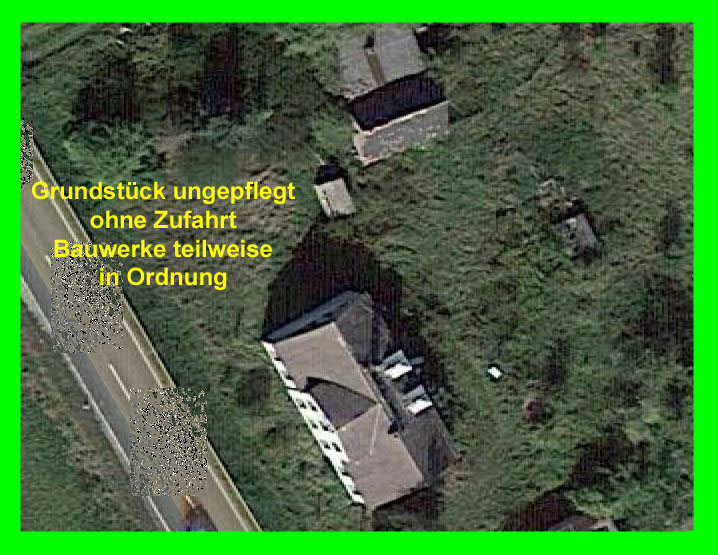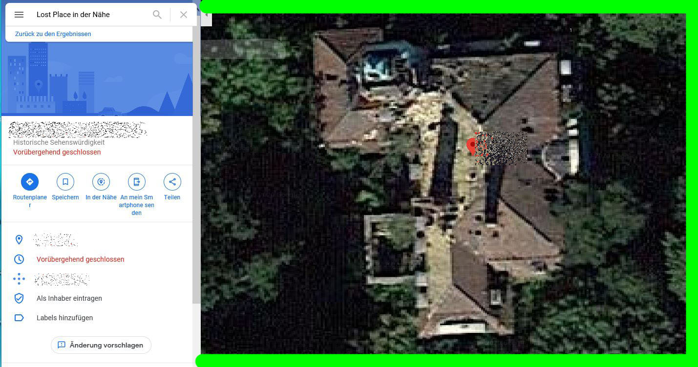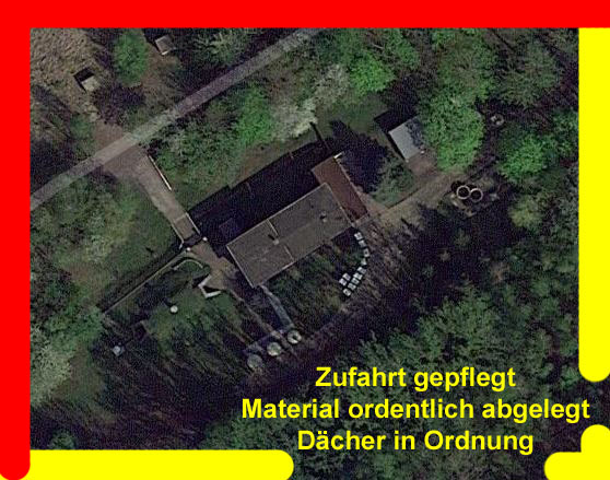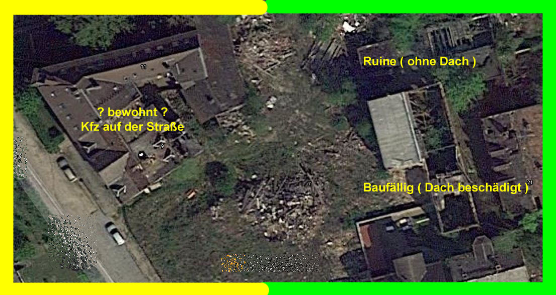 Ein Hallo, an die Neueinsteiger unter Euch. An dieser Stelle möchte ich zwei Fragen beantworten, die Ihr „logischerweise“ stellt. Die 1. : Wie finde ich ein „Lost Place“ bzw. ein verlassenes Objekt? Wenn Ihr noch zu Hause, ein oder mehrere verlassene Objekte suchen möchtet, brauch Ihr nur einen Computer oder Smartphon mit Internetzugang. Es gibt zahlreiche Webseiten, über die ich hier aber keine Ausführungen machen möchte. Dies kann jeder eigenständig in Augenschein nehmen. Die meißten unter Euch möchte aber selber „verlassene Orte“ finden. Diese sollen kaum bekannt sein und dann sind auch besondere Fotos möglich. Dazu könnt Ihr direkt unter Verwendung von Luftbildern im Internet suchen: Ihr startet das Programm: Google Earth ( Installation ist notwendig ) oder im Browser: Google Maps im Satelliten Modus. Mit diesen Programmen „im Satelliten Modus – Luftbilder“ könnt Ihr auf die Suche gehen. Bitte denkt bei der Suche über das Internet, das sich die Objekte in der Zwischenzeit verändert haben, wieder genutzt werden oder abtgerissen wurden. Die Luftbilder können nicht aktuell sein, sondern sind teilweise über 10 Jahre alt! Ein Abriss erfolgt oft innerhalb von ein paar Tagen oder Wochen. Was gestern noch da war, kann morgen schon weg sein … „leider“. Solltet Ihr „vor Ort“ am Live Objekt feststellen, das es kein „Verlassenes Objekt“ mehr ist, so solltet Ihr die Commiunity umgehend informieren, damit dieses Objekt schnellstens aus den Datenbanken gelöscht werden kann. Als zweites könnt Ihr über das Textsuchfeld ( links oben ) suchen. Gebt einfach Begriffe wie: „Lost Place“, „Verlassen“ oder „Ruine“ und „in der Nähe suchen“ ein. Als drittes könnt ihr das Luftbild analysieren und nach „verlassenen Objekten“ suchen. Hierzu habe ich einige Luftbilder zur Orientierung: |